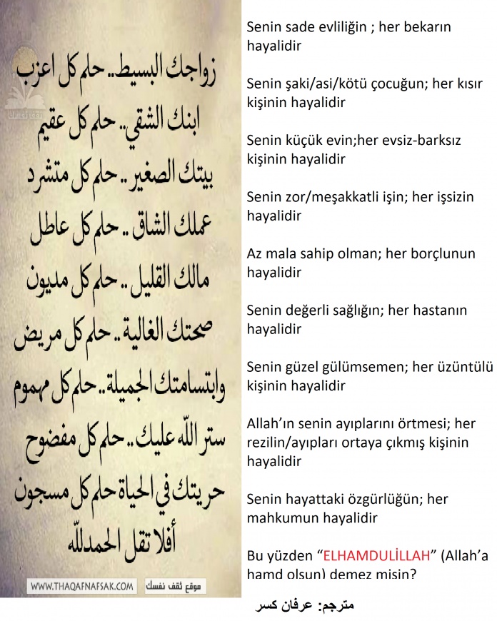 أرْضَى النَّاس مَنْ كانَتْ أخْلاقُهُ رَضِيَّةً İnsanların en hoşnudu ahlakı güzel olandır ** ** ** ** يوجد دائماً من هو أشقى منك , فابتسم Gülümse çünkü her zamanda sende daha bahtsız olanlar vardır ** ** ** ** يظل الرجل طفلاً , حتى تموت أمه , فإذا ماتت ، شاخ فجأة Erkek hep bebek kalır ta ki annesi ölünceye kadar annesi ölünce hemen ihtiyarlar
