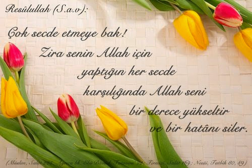 “Çok secde etmeye bak! Zira senin Allah için yaptığın her secde karşılığında Allah seni bir derece yükseltir ve bir hatânı siler.” Müslim, Salât 225. Ayrıca bk. Ebû Dâvûd, Tatavvu’ 22; Tirmizî, Salât 169; Nesâî, Tatbîk 80, 89