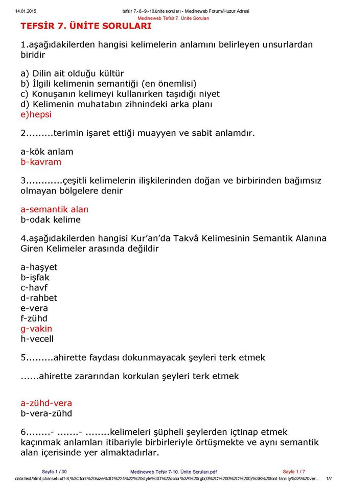 TEFSİR 7 / 10 Ünite Soru ve Cevap Medineweb Çalışmaları