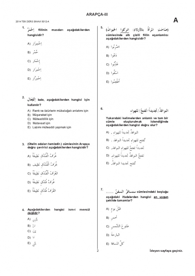 09 Şubat 2014 | Arapça 3 İlahiyat 2012 / 2013 / 2014 Tek Ders Sınavı 2012