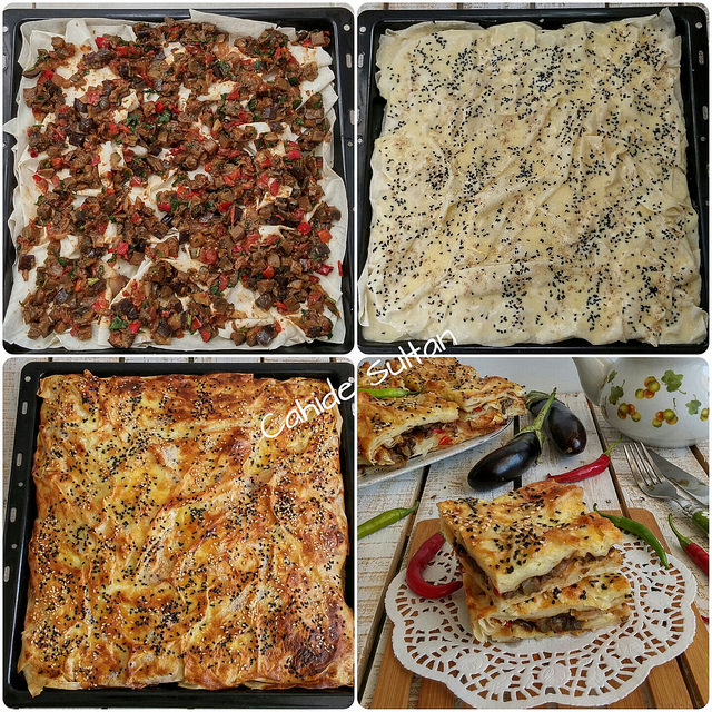 18 Aralık 2010 | "Patlıcanlı Börek"/medineweb mutfağı Malzemeler 6 adet yufka Sos malzemeleri 2 su bardağı yoğurt 2 yumurta 1 su bardağına yakın zeytinyağı İç malzemesi 1 çay bardağı zeytinyağı 1 orta boy soğan 1 adet kırmızı biber 2 adet yeşil biber 6 orta boy patlıcan 1 orta boy domates Yarım demet maydanoz 2 çay kaşığı karabiber 1 çay kaşığı kimyon arzuya göre biraz acı pulbiber tuz... Patlıcanlı börek nasıl yapılır? Öncelikle içi hazırlayın. Tencereye zeytinyağını koyup, küp doğranmış soğanı ve küçük doğranmış biberleri ilave edin. Soğan sararana kadar soteleyin. Patlıcanları küp küp doğrayıp ilave edin. Tencerenin kapağını kapatıp yumuşamasını sağlayın. 10 dakika sonra kapağı açıp biraz daha soteleyin. Küp doğranmış domatesi ilave edin. Domates saldığı suyu çekince, ocağın altını kapatın ince doğranmış maydanozu, kimyon, karabiber ve tuzu ilave edin. Bir kenarda soğumaya bırakın. Diğer tarafta sos malzemelerini bir kapta karıştırın. Sos malzemelerinin daha iyi bütünleşmesi açısından el blenderı ile çekmenizi tavsiye ederim. Orta boy bir fırın tepsisini yağlayın bir yufkayı büzüştürerek serin. Üzerine 4 yemek kaşığı kadar sostan gezdirin. İkinci yufkayı serip yeniden 4 yemek kaşığı sos gezdirin. Üçüncü yufkaya sos sürmeyin. İç malzemesini üçüncü yufkanın her tarafına gelecek şekilde yerleştirin. dördüncü ve beşinci yufkaları da üst üste koyup yine sos gezdirin. Son yufkayı serin. Kenar kısımlarını diğer yufkaların altına doğru katlayın. Kalan çok az sosa 1 yumurta kırıp karıştırın son yufkanın üzerine sürün. Bıçakla böreğin üzerine delikler açın. Susam ve çörekotu serpip 185 derecelik fırında pişmeye bırakın. Üzeri nar gibi kızarınca fırından alın. Afiyet şifa olsun.