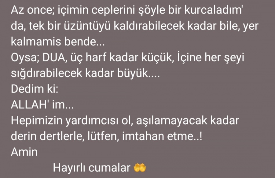 Cumamız ve Ramazanımız hayırlı olsun; Rabbim bugünde ettiğimiz duaları ve şimdiden oruçlarımızı kabul buyursun dilerim; amin ecmain...
