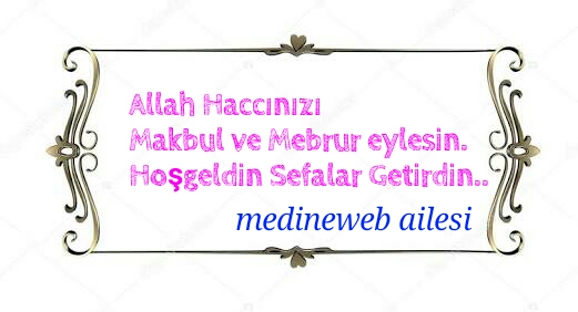 15 Kasım 2011 | Hoşgeldin Sevgili HACIMIZ (Mehmet Akif) ![]() Bismillahirrahmanirrahim Onda apaçık deliller, Makam-ı İbrahim vardır. Oraya kim girerse, güven içinde olur. Yolculuğuna gücü yetenlerin haccetmesi, Allah'ın insanlar üzerinde bir hakkıdır. Kim inkâr ederse (bu hakkı tanınmazsa), şüphesiz Allah bütün âlemlerden müstağnidir. (Kimseye muhtaç değildir, her şey O'na muhtaçtır.) Âli İmran (97) HACIMIZ VAR..BAYRAK ASALIM DEDİK ![]() ![]() Degerli Medineweb Ailesi bir ay öncesi kutsal.topraklara yolcu ettiÄ£imiz emektar uyemiz ve çalışkan editörümüz mehmet akif (Göknur) bu kutlu vazifeyi ifâ etmiş ve hayirla yurduna evine dönmüş, çocuklarna kavuşmuştur ![]() HACIMIZ GELMIŞ..HOŞGELMİŞ..SEFALAR GETİRMİŞ...HACIYI Hemen ziyarrt etmek gerekir... Hep beraber ziyarete.. ![]() ![]() Allahım; Kur'anı Keriminde,''Yoluna Gücü Yeten herkesin,O eve gidip haccetmesi insanlar üzerine Allahın bir hakkıdır''Buyurdun. Bu emre uyarak,Hazırlıklarini yapıp.bu kutlu vazifeyi yerine getiren Hacılarimizın haclarıni Kabul eyle... ![]() Rabbim tez zamanda bizleride nasibeylesin inşallah.... Haccıniz mebrur ve makbul.olsun sayin hacim..Bizleride duana kattiysan bir nebze sevinir umutlanır şu gariplerde...