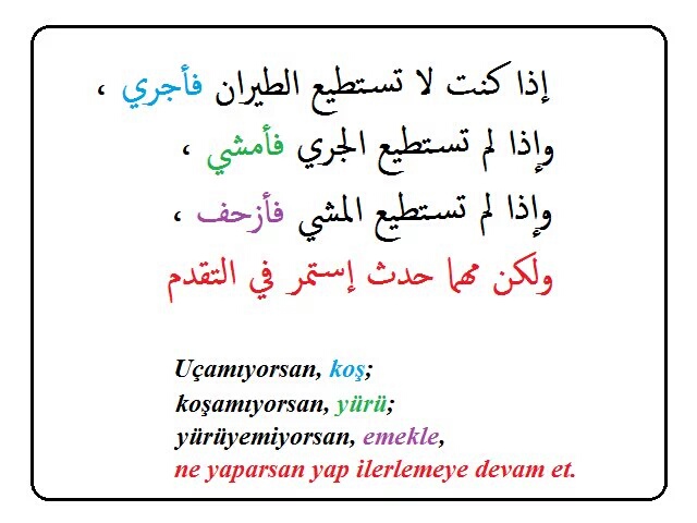 19 Ekim 2008 | المؤمن بشرة في وجهه و حزنه في قلبه MÜMİN SEVİNCİ YÜZÜNDE ÜZÜNTÜSÜ KALBİNDE OLANDIR إذا لم تعلم أين تذهب , فكل الطرق تفي بالغرض Nereye gideceğini bilmiyorsan tüm yollar seni götürür يوجد دائماً من هو أشقى منك , فابتسم Gülümse çünkü her zamanda sende daha bahtsız olanlar vardır يظل الرجل طفلاً , حتى تموت أمه , فإذا ماتت ، شاخ فجأة Erkek hep bebek kalır ta ki annesi ölünceye kadar…annesi ölünce hemen ihtiyarlar عندما تحب عدوك , يحس بتفاهته Düşmanını sevince önemsizliğini anlar إذا طعنت من الخلف , فاعلم أنك في المقدمة Eğer arkadan bıçaklanırsan bilki en öndesin