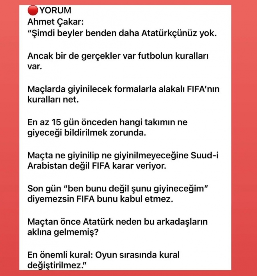 Arabistan'da futbol oynamakta ne cidden bilmediğimden soruyorum. Hayır adamın forma boyuna bile müdahale edebilirler. Şort dizaltı olacak felan.) Bizde Atatürk formasıyla kaç defa sahaya çıkılmış hayır bilmediğimden soruyorum. Arabistan'a gidip bu formayla sahaya çıkmak. Tam tersini düşünün. Bizim sahalarda Arapların böyle bir formayla çıktığını yeryerinden oynardı. Ülke Arapların oldu diye.Bu nasıl bir organizasyon? Arabistan'da Atatürkçülüklerinin tutması neyin nesi? Herkesi içine çekmek için İstiklal marşı da söyletilmedi deniyor ama karar sonrası tepki olarak İstiklal marşı okumak istiyorlar izin verilmiyor. Atatürk, futbol putumuz kolkola girdi başımızdan boca ediliyor. Taraf olmayan taşlanıyor. Allah kurtarsın hepimizi. Samsunda 19 Mayıs'ta Atatürk stadında oynansin. Seyret coşkuyu