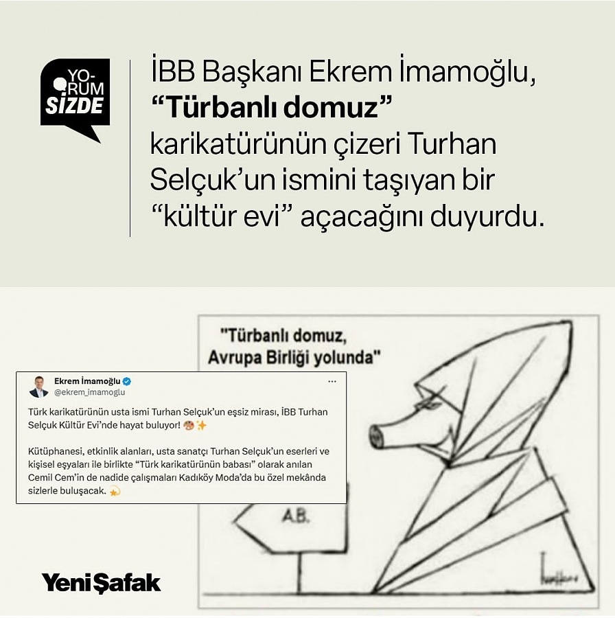 08 Nisan 2014 | Türbanlı domuz İBB Başkanı Ekrem İmamoğlu, "Türbanlı domuz" karikatürünün çizeri Turhan Selçuk’un ismini taşıyan bir kültür evi açacağını duyurdu. Bu konu hakkında ne düşünüyorsunuz