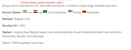 25 Şubat 2011 | NOT: ramazan yetgin videosunda OPEC kurucu üyelerinden soru çıkabilir dedi ama şaşırtıcı seçenek olarak SURİYE seçeneklerde verilir dedi VENEZUELA gören hemen onu işaretler ama o kurucu üyeler arasında dedi bilginize!...... |