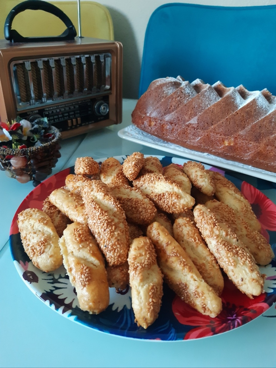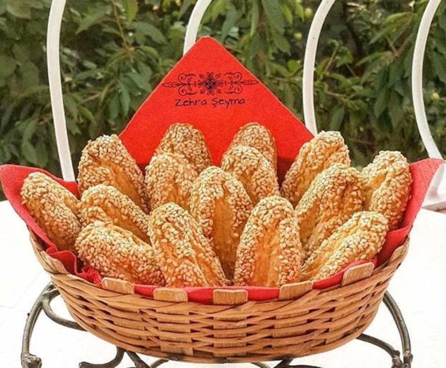 18 Aralık 2010 | TUZSUZ NAFiYE Malzemeler: 250 gr tereyağı 2 yumurta (sarısı içine , akı dışına) 1 çay bardağı tozşeker 1 çay bardağı sıvıyağ 1 paket kabartma tozu 1 çorba kaşığı elma sirkesi Aldığı kadar un (4-5 bardak kadar) ÜZERI iÇiN: Susam YAPILIŞI: Hamuru yoğurun. Parmaktan biraz kalın şekil verip önce yumurta akına sonra susama bulayın. Yağlı kağıt serilmiş tepsiye dizin ve ortasına bıçak batırın. 170 derecelik fırında üzeri kızarana kadar pişirin servis edin. Afiyet olsun.