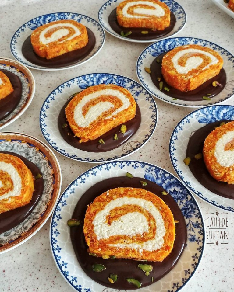 18 Aralık 2010 | "HİNDİSTAN CEVİZLİ RULO HAVUÇ PASTASI/Medineweb Mutfağı Malzemeler 1 kg Havuç 1 su bardağı su 1 su bardağı şeker 1 büyük portakal kabuğu rendesi 1 yemek kaşığı dolusu tereyağı 1 paket petibör bisküvi Hindistan cevizi dolgusu için 1 poşet toz vanilyalı pasta kreması veya krem şanti. (krem şanti olursa sütü azaltın) 1 su bardağı süt 2 su bardağı hindistan cevizi HAZIRLANIŞI Havuçları temizleyip rendeleyin. 1 su bardağı su ekleyip ağzını kapatarak yumuşayana kadar pişirin. Şeker ve tereyağını ekleyip suyunu tamamen çekene kadar pişirin. Soğuduktan sonra, elinizle kırdığınız petibör bisküviyi ve p. Kabuğu rendesini ekleyip karıştırın. 2 kat strech film üzerine havuçlu karışımı döküp dikdörtgen şeklinde yayın. Çok ince olmasın. Diğer tarafta toz pasta kremasına sütü ekleyip çırpın. Hindistan cevizini de ekleyip karıştırın. Eğer çok katı olursa, biraz daha süt ekleyip kıvamını açın. Havuçlu harcın üzerine dikkatli bir şekilde yayın. Strech film yardımıyla rulo yapıp kenarlarını kapatın. Dondurucuya kaldırıp, en az 3 saat bekletin. Bu süre sonunda dilimleyerek servis edin.
