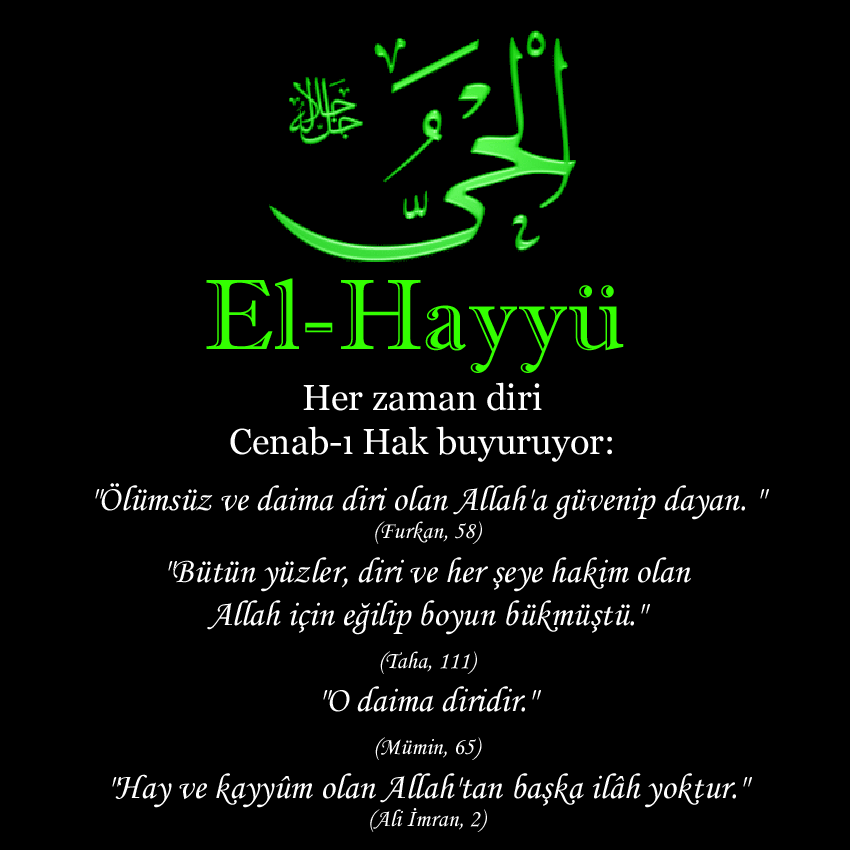 Hayy İsminin Kuran’da Geçtiği Ayetler (2:255) Allah’tan başka hiçbir ilâh yoktur. O dâima diridir (hayydır), bütün varlığın idâresini yürütendir (kayyûmdur). O’nu ne gaflet basar, ne de uyku. Göklerde ve yerde ne varsa hepsi O’nundur. İzni olmadan huzûrunda şefaat edecek olan kimdir? O, kullarının önlerinde ve arkalarında ne varsa hepsini bilir. Onlarse O’nun dilediği kadarından başka ilminden hiçbir şey kavrayamazlar. O’nun kürsîsi, bütün gökleri ve yeri kucaklamıştır. Onların her ikisini de görüp gözetmek, O’na zor gelmez. O çok yücedir, çok büyüktür. (3:2) Allah, kendisinden başka hiçbir tanrı bulunmayandır. Diridir, kayyumdur. (40:65) O diridir. O’ndan başka hiçbir tanrı yoktur. O hâlde yalnızca Allah’a itaat ederek (samimi olarak) O’na tapının. Hamd, âlemlerin Rabbine mahsustur.