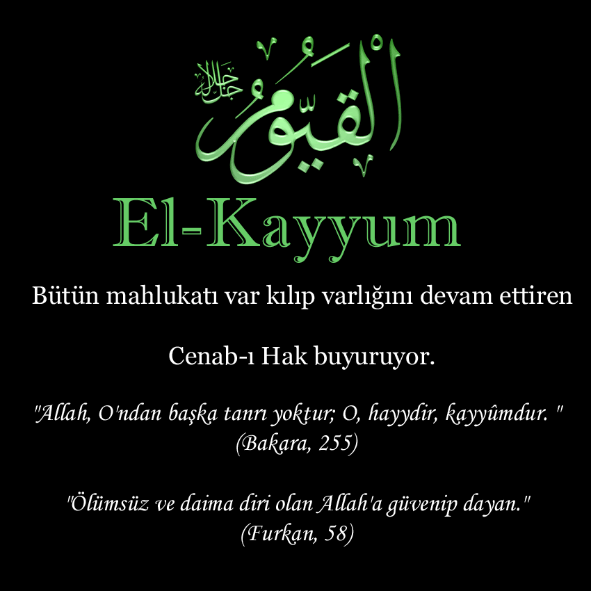 El-Kayyum (Celle Celâlühü) Bütün mahlukatı var kılıp varlığını devam ettiren Cenab-ı Hak buyuruyor. اَللّٰهُ لَٓا اِلٰهَ اِلَّا هُوَۚ اَلْحَيُّ الْقَيُّومُۚ لَا تَأْخُذُهُ سِنَةٌ وَلَا نَوْمٌۜ لَهُ مَا فِي السَّمٰوَاتِ وَمَا فِي الْاَرْضِۜ مَنْ ذَا الَّذ۪ي يَشْفَعُ عِنْدَهُٓ اِلَّا بِاِذْنِه۪ۜ يَعْلَمُ مَا بَيْنَ اَيْد۪يهِمْ وَمَا خَلْفَهُمْۚ وَلَا يُح۪يطُونَ بِشَيْءٍ مِنْ عِلْمِه۪ٓ اِلَّا بِمَا شَٓاءَۚ وَسِعَ كُرْسِيُّهُ السَّمٰوَاتِ وَالْاَرْضَۚ وَلَا يَؤُ۫دُهُ حِفْظُهُمَاۚ وَهُوَ الْعَلِيُّ الْعَظ۪يمُ "Allah, O'ndan başka tanrı yoktur; O, hayydir, kayyûmdur. " (Bakara, 255) وَتَوَكَّلْ عَلَى الْحَيِّ الَّذ۪ي لَا يَمُوتُ وَسَبِّـحْ بِحَمْدِه۪ۜ وَكَفٰى بِه۪ بِذُنُوبِ عِبَادِه۪ خَب۪يراًۚۛ "Ölümsüz ve daima diri olan Allah'a güvenip dayan." (Furkan, 58) Allah zatı ve yüceliği ile vardır; her şeyin var olması, varlığını sürdürmesi, ayakta durması O'nun varlığına bağlıdır. Kur'an-ı Kerim'de Hay ismi ile çoğu zamanda birlikte zikredilir. Bu isimlerin, "İsm-i A 'zam" olduğu da söylenmiştir. Bu ismin çeşitli tanımlamaları vardır: Katede'nin görüşü: Kayyûm, yaratıklarını koruyup idare eden, işlerini düzenleyendir. Hasan Basri: Kayyûm, iyi ya da kötü yaptıklarının karşılığını vermek için her canlının başında duran ve onu gözetleyendir. O, her şeyi bilir ve hiçbir şey O'na gizli kalmaz. El-Hattabi: Kayyûm, sonu olmayan ve varlığı daim olandır Kayyûm, Allah'ın kusursuz güç, kuvvet ve üstünlüğe sahip olduğunu gösterir. O, yalnız başına kâimdir. ayakta kalmak için hiçbir yönden kimseye ihtiyacı yoktur. O, kendi kendine yetendir ve başkasına muhtaç değildir. O'nun dışında her şey O'na muhtaçtır. Her şeyi ayakta tutan ve koruyan O'dur. O'nun desteği olmadan hiçbir şey ayakta duramaz ve varlığını devam ettiremez. Bu, O'nun mükemmel gücünü gösterir. O öyle bir hayy ve kayyumdur ki, O'nu ne gaflet basar, ne uyku; daima âlim, daima her şeyden haberlidir. Göklerde ve yerde, yukarılarda, aşağıda ne varsa O'nun; görünür, görünmez, bütün varlık O'nun mülküdür. Tüm sebeb O, tüm gaye O, herşeyin maliki olan O; Allah'ın mülkü olan bu yaratıklardan kimin haddi ki Allah'ın izni olmaksızın yüce huzurunda şefaat edebilsin, bu halde hangi budaladır ki Allah'ın emri olmadan bunların birinden şefaat dilenebilsin. Çünkü Allah yukarıların aşağıların, önlerindekini ve arkalarındakini, geçmişlerini, geleceklerini bildiklerini ve bilmediklerini bilir, O'nun ilminden gizli hiçbir şey yoktur. Bunlar ise O'nun bildiklerinden hiçbirini bilemezler. Ancak dilediği kadarını kavrayabilirler. Allah dostlarının tecrübe edip kabul ettiklerine göre, "Ya Hayyu yâ Kayyûm, lâ ilâhe illâ ente" (Ey diri ve kâim olan! Senden başka ilâh yoktur) duasını okuyan ve bunu tekrarlayan kimsenin kalbi ve aklı dirilir. Bu iki isimle yardım dilemek sıkıntılardan, dert ve kederlerden, zorluk ve darlıklardan kurtulmak ve isteklere kavuşmakta daha etkilidir.