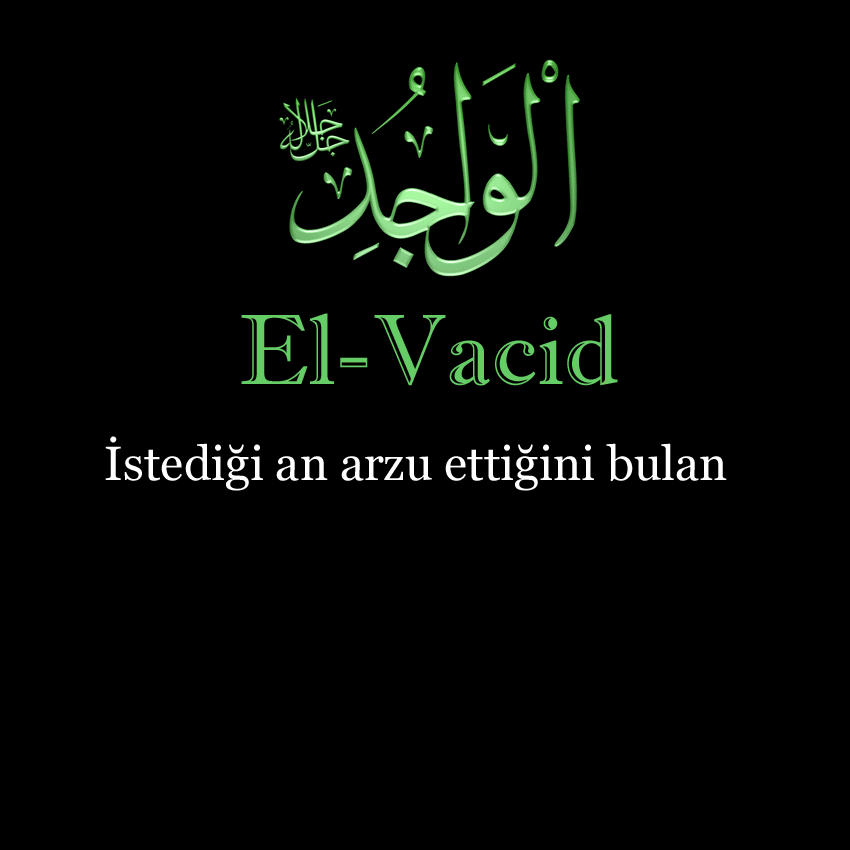 -Vacid (Celle Celâlühü) İstediği an arzu ettiğini bulan Bu isim Kur'an'da zikredilmemiştir. Vâcid kelimesi, bulan, vücuda getiren, hiçbir şeye ihtiyacı olmayan anlamına gelir. Yüce Allah istediği şeyi, istediği canlıyı istediği zaman bulur, hükmünü infaz eder. Bir şeyi bulmak için, meydana getirmek için O'nun zamana, mekana, plana veya başka bir şeye ihtiyacı yoktur. Hiçbir canlı O'ndan gizlenemez. Hiçbir şey O'ndan kaçamaz. O'nun hiçbir şeye ihtiyacı yoktur. Her şey O'na muhtaçtır. Cenab-ı Hakk'ın, herhangi bir şeyi ele geçirmek için; zaman kollamaya bunu sağlamak amacıyla önlem almaya ihtiyacı yoktur. Herşey daima O'nun huzurundadır. Dilediği an hükmünü infaz eder ve bunda da O'nun için hiçbir zorluk söz konusu olmaz. Ne lütfunu hemen kullarına ulaştırmada, ne de cezasını yerine getirmekte O'nun için bir güçlük bulunmaz. Kişi ihtiyacı olmayan bir şeyi kayıp ettiği zaman, yitiren sayılmaz. Zatına ve zâtının kemaline bağlantılı olmayan bir şey elde ettiği zaman da kendisine Vacid denilmez. Vacid, ilahi sıfatlar babında mutlaka bulunması gereken hususlara ihtiyaç duymaksızın kendisinde bulunan demektir. İşte bu, Allah için mevcuttur. Allah bu itibarla Vacid olunmuştur. Hem de Vacid-i Mutlak. Ondan başkası, bazı ahlaki faziletler ve kemalatlar elde edebise bile de ona Vacid denilemez. Çünkü o bunun yanında elde edemediği bir çok şeyler kaybetmiştir. Bir şeyler elde edebilse, dahi olmayan kişilere nisbeten bir şeyler elde etmiştir. Bir kul, bilinmesi tamamen kendi yararına olup da haz alacağı herhangi bir ihtiyaç içerisinde bulunmadığı bir makama ulaşırsa, bütün ihtiyaçşarını karşılayacak olan Allah'ı vekil olarak bulur.