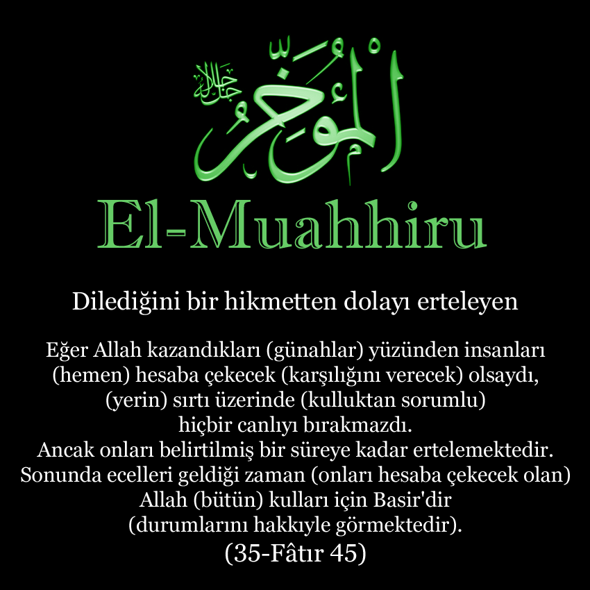 18 Aralık 2010 | Sorularla Esmaul Hüsna: El-Muahhir, El-Evvel, El-Âhir Muahhiru (Celle Celâlühü) Dilediğini bir hikmetten dolayı erteleyen وَلَوْ يُؤَاخِذُ اللّٰهُ النَّاسَ بِمَا كَسَبُوا مَا تَرَكَ عَلٰى ظَهْرِهَا مِنْ دَٓابَّةٍ وَلٰكِنْ يُؤَخِّرُهُمْ اِلٰٓى اَجَلٍ مُسَمًّىۚ فَاِذَا جَٓاءَ اَجَلُهُمْ فَاِنَّ اللّٰهَ كَانَ بِعِبَادِه۪ بَص۪يراً Eğer Allah kazandıkları (günahlar) yüzünden insanları (hemen) hesaba çekecek (karşılığını verecek) olsaydı, (yerin) sırtı üzerinde (kulluktan sorumlu) hiçbir canlıyı bırakmazdı. Ancak onları belirtilmiş bir süreye kadar ertelemektedir. Sonunda ecelleri geldiği zaman (onları hesaba çekecek olan) Allah (bütün) kulları için Basir'dir (durumlarını hakkıyle görmektedir). (35-Fâtır 45) Mukaddim ve Muahhir isimlerinden birini zikretmeden yalnız ötekiyle dua etmek caiz değildir. Her ikiside Allah'ın fiili sıfatlarındandır. Dilediğini öne alan, dilediğini arkada bırakan O'dur. Geri bıraktığını öne çıkarmaz, öne çıkardığını da geriye bırakmaz. Allah'ın kullarının teşebbüslerini bazen onların beklentilerine uymayacak şekilde ertelemesinde mutlaka derin hikmetler vardır. O'nun takdirini saygı ile karşılayıp bu ertelemeyi O'ndan olduğu bilinciyle kabul etmek lazımdır. İşte bu kulluktur. Bu İsmi bilmenin Faydaları: Müslüman, Allah'ın öne çıkardığını öne çıkarmalı arkaya koyduğunu arkaya koymalıdır. Müslüman, Allah'ın öne çıkardığını öne çıkarmalı arkaya koyduğunu arkaya koymalıdır. Allah'ın Mukaddim ve Muahhir olduğunu bilen kimse, ibadet ve iyiliklerinin çokluğuna güvenmez, günah ve kötülüklerinin çokluğu nedeniyle de Allah'tan ümit kesmez. Zira Allah'a uzak gibi görünen nice kimseler yakın, yakın gibi görünen nice kimseler de gerçekte O'ndan uzaktır. Daima kötü sondan, günahları öne alıp ibadetleri ertelmekten Allah'a sığınmalıdır. Havas ve Esrarı El-Muahhır ism-i şerifi, arzu edilmeyen kişi ve şeylerin geciktirilmesi için, "Ya Muahhır Celle Celalühü" diyerek sürekli okunur. El-Muahhır ism-i şerifini çokça "Ya Muahhır Celle Celalühü" diye zikredene tevbe ve takva kapıları açılır.