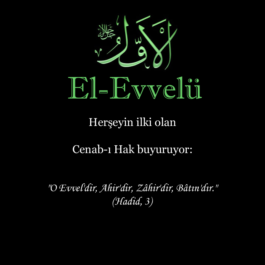 El-Evvelü (Celle Celâlühü) Herşeyin ilki olan Cenab-ı Hak buyuruyor: هُوَ الْاَوَّلُ وَالْاٰخِرُ وَالظَّاهِرُ وَالْبَاطِنُۚ وَهُوَ بِكُلِّ شَيْءٍ عَل۪يمٌ "O Evvel'dir, Ahir'dir, Zâhir'dir, Bâtın'dır." (Hadid, 3) Cenab-ı Hak yaratmayı başlatan ve sürdürendir. Bütün mükevvenatı var eden, bütün nesne ve olayları icad edip ortaya çıkarandır. Her şeyden evveldir. Bir evveli, bir öncesi yoktur. Başlangıcı yoktur ve her şeyin ilkidir. Çünkü varlıkların hepsinin başlangıcı ve hepsini ortaya çıkarandır. Ve son, hepsinin yok olmasından sonra O, bâkidir وَلَا تَدْعُ مَعَ اللّٰهِ اِلٰهاً اٰخَرَۢ لَٓا اِلٰهَ اِلَّا هُوَ۠ كُلُّ شَيْءٍ هَالِكٌ اِلَّا وَجْهَهُۜ لَهُ الْحُكْمُ وَاِلَيْهِ تُرْجَعُونَ "O'nun zâtından başka her şey helak olacaktır..." (Kasas, 88) Yer yüzünde bulunan her canlı yok olacak, ancak azamet ve ikram sahibi Rabbinin zâtı bâki kalacak ." (Rahman, 26-27) âyetlerinin ifade ettikleri mânâya göre varlıkların hepsi helak ve fenâya gider ve gidebilir, ancak O, kalır. Bütün yaratıkların, varlık sebepleri ortadan kalkınca esasen helak edilirler ve yok olurlar. Sonra bütün işler ona döndürülür. Binaenaleyh O, hepsinden evvel olduğu gibi, hepsinin gayesi ve varlığın sonudur. Binaenaleyh O'nun için ne yalnız Evvel ve de yalnız Ahir diye hükmetmemeli, "Evvel ve Ahir" demelidir. Allah Teâlâ, başlangıcı olmayan evvel, sonu olmayan Âhir'dir. O, her şeyden önceki Evvel'dir, her şeyden sonraki Âhir'dir. O, var etmede ve yaratmada Evvel, hidayete ve başarıya erdirmede Âhir'dir. O, kalplerdekini bilen Evvel, ayıp ve kusurları örten Âhir'dir. Başlangıç ilk olarak Allah'la başladı, son olarak dönüş yine O'nadır.