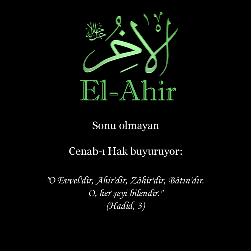 El-Ahir (Celle Celâlühü) Sonu olmayan Cenab-ı Hak buyuruyor: هُوَ الْاَوَّلُ وَالْاٰخِرُ وَالظَّاهِرُ وَالْبَاطِنُۚ وَهُوَ بِكُلِّ شَيْءٍ عَل۪يمٌ "O Evvel'dir, Ahir'dir, Zâhir'dir, Bâtın'dır. O, her şeyi bilendir." (Hadid, 3) Hiç bir şey yok iken Allah vardı ve her şey yok olduktan sonra Allah yine var olacaktır. وَلَا تَدْعُ مَعَ اللّٰهِ اِلٰهاً اٰخَرَۢ لَٓا اِلٰهَ اِلَّا هُوَ۠ كُلُّ شَيْءٍ هَالِكٌ اِلَّا وَجْهَهُۜ لَهُ الْحُكْمُ وَاِلَيْهِ تُرْجَعُونَ "O'nun zâtından başka her şey helak olacaktır..." (Kasas,88), كُلُّ مَنْ عَلَيْهَا فَانٍۚ (55-Rahmân 26) وَيَبْقٰى وَجْهُ رَبِّكَ ذُوالْجَلَالِ وَالْاِكْرَامِۚ Yer yüzünde bulunan her canlı yok olacak, ancak azamet ve ikram sahibi Rabbinin zâtı bâki kalacak." (Rahmân, 26,27) âyetlerinin ifade ettikleri mânâya göre varlıkların hepsi helak ve fenâya gider ve gidebilir, ancak O, kalır. Bütün yaratıkların, varlık sebepleri ortadan kalkınca esasen helak edilirler ve yok olurlar. Sonra bütün işler ona döndürülür. O, hepsinden evvel olduğu gibi, hepsinin gayesi ve varlığın sonudur. O'nun için ne yalnız Evvel ve de yalnız Ahir diye hükmetmemeli, "Evvel ve Ahir" demelidir. Allah Teâlâ, sonu olmayan Âhir'dir. O, her şeyden sonraki Âhir'dir. O, hidayete ve başarıya erdirmede Âhir'dir. Son olarak dönüş yine O'nadır. Allah'ın Âhir olduğunu bilmek, insana sebeplere fazla önem vermemeyi, onlara bel bağlayıp güvenmemeyi, üzerinde fazla durmamayı öğretir. Bu sebeplerin sonuçta mutlaka yok olacağını ve son bulacağını, sadece Âhir olan Allah'ın bâki kalacağını bilmesini sağlar. Geçici varlıklara bağlanmak, yokluğa bağlanmaktır. Halbuki Âhir olan Allah'a bağlanmak, kesinlikle yok olmayacak ve ebediyen varolacak olana bağlanmaktır. O'na bağlanan yok olmayacak ve varlığı bir kesintiye uğramayacaktır. Oysa yok olacak geçici şeylere bağlanmak böyle değildir. Fani şeylererin yok olmasıyla, onlara bağlananlar da yok olacaktır. Allah'ı bu şekilde tanıyan daha bir samimiyetle O''na ibadet etmeye çalışır. O'ndan başka hiçbir şeye güvenip bel bağlamaz. Sadece Allah'a yönelmenin ve O'na dayanıp güvenmenin bir zorunluluk olduğunu anla. Her şeyin O'na döneceğini hatırından çıkarma. O'na kulluk et ki, kulluğun O'nun katında geçerli olsun.