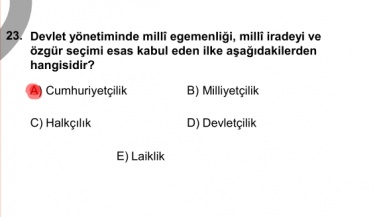 25 Şubat 2011 | Türk Devriminin “Cumhuriyetçilik ilkesi saltanat ve hilafete karşıdır.” yargısının, 1. egemenliğin millete ait olması, II. yönetimin din kurallarına dayandırılmaması, III. azınlık okullarının öğretime devam etmesine izin verilmesi durumlarından hangileriyle ilgili olduğu savunulabilir? A) Yalnız I B) Yalnız II C) Yalnız III D) I ve II E) II ve III (2010 KPSS – Lisans) ************************ Mustafa Kemal, “.Artık hükümet ile millet arasında mazideki ayrılık kalmamıştır. Hükümet millettir ve millet hükümettir. Artık hükümet ve hükümet mensupları kendilerinin milletten ayrı olmadıklarını ve milletin efendi olduğunu tamamen anlamışlardır.” demiştir. Mustafa Kemal’in bu anlatımıyla aşağıdaki kavramlardan hangisini vurguladığı savunulabilir? A) Tam bağımsızlık B) Barışseverlik C) Bilimsellik D) Milli birlik ve beraberlik E) Vatanseverlik (2011 – KPSS) |