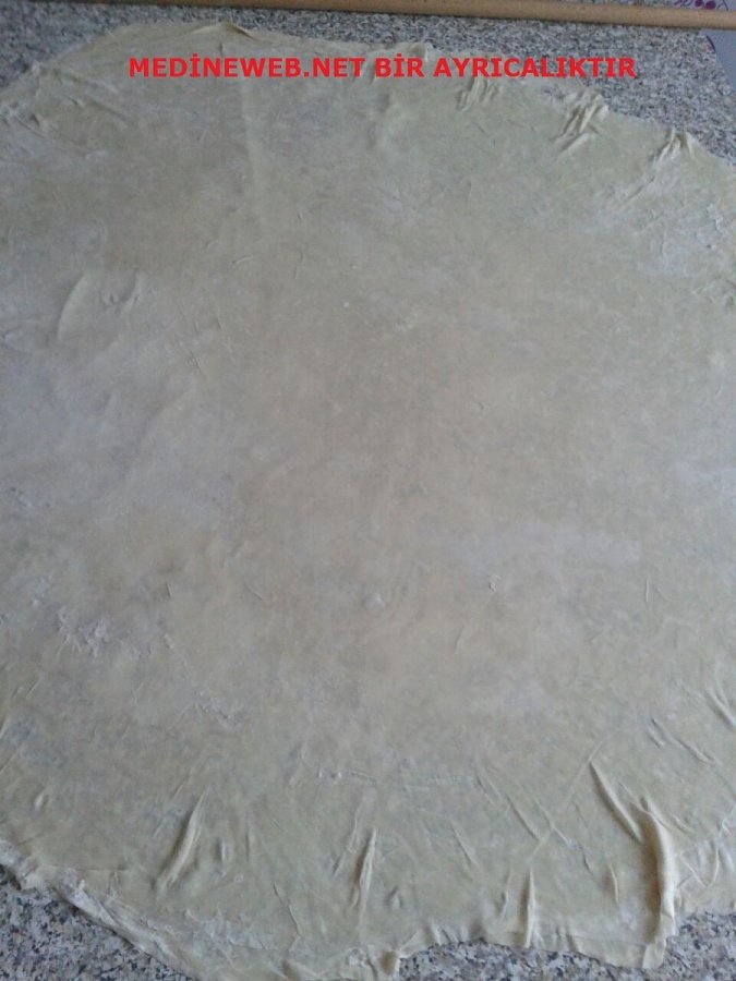 25 Şubat 2011 | açtığımız hamurun üstüne tepsimizi koyalım bıçakla tepsi büyüklüğünde keselim bu düzgün parçayı yağladığımız tepsimizin altına düzgünce yayalım yağlamamın sebebi altı pişmemiş kalmıyor yine altına bakıp pişmediyse fırında alt pişecek şekilde ayarlayabilirsiniz diğer kalan parçaları bir kat olacak şekilde tepsiye dizeriz beze 10'lu olduğu için altına tüm serip kalan parçalardan da 2 kat daha olsa toplamda 30 kat olmuş oluyor |